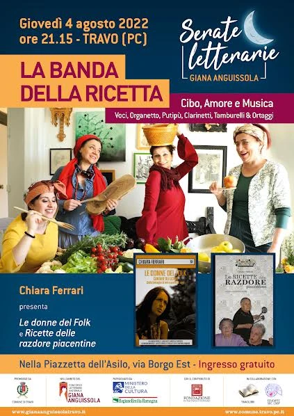 Di cibo e di musica parlerà Chiara Ferrari, che presenterà i libri Le Donne del Folk. Cantare gli ultimi, uscito nel 2021 per Interno4 Edizioni, e Le ricette delle razdore piacentine, pubblicato da Officine Gutenberg.