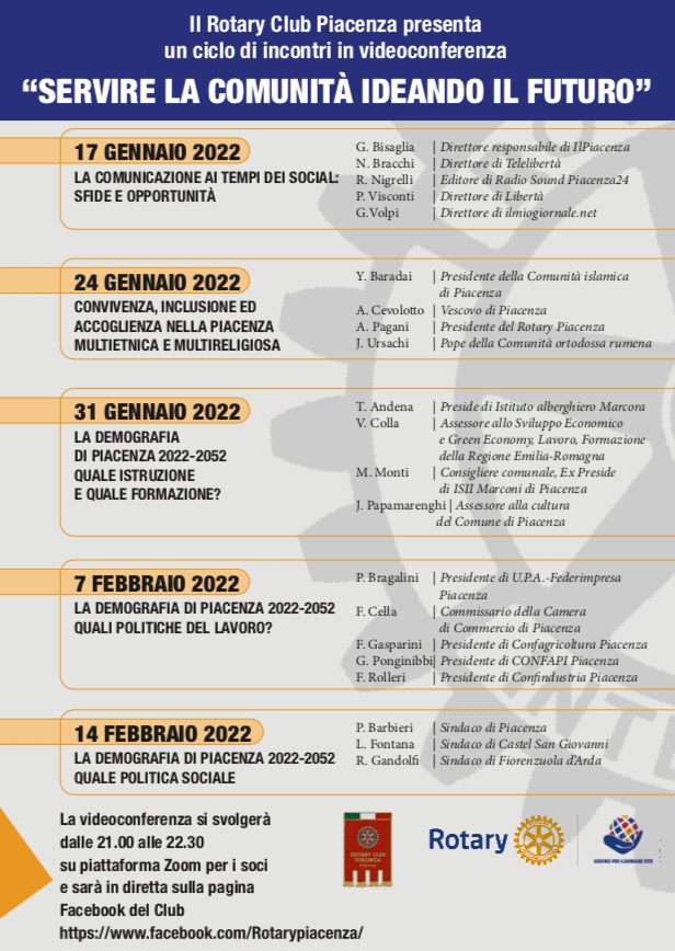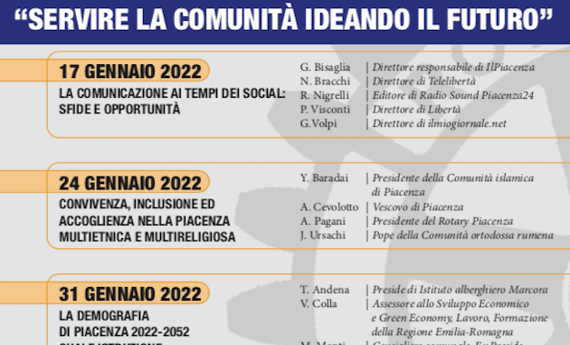 Si parte il 17 gennaio con “La comunicazione ai tempi dei social: sfide e opportunità” relatori direttori ed editori di testate giornalistiche piacentine: Giampietro Bisaglia, Nicoletta Bracchi, Rita Nigrelli, Pietro Visconti e Giovanni Volpi; il 24 gennaio si parlerà di “Convivenza, inclusione ed accoglienza nella Piacenza multietnica e multireligiosa” con il Vescovo Adriano Cevolotto, il Presidente del Rotary Piacenza Augusto Pagani, Yassine Baradai Presidente della Comunità islamica di Piacenza e Jurie Ursachi Pope della Comunità ortodossa rumena.