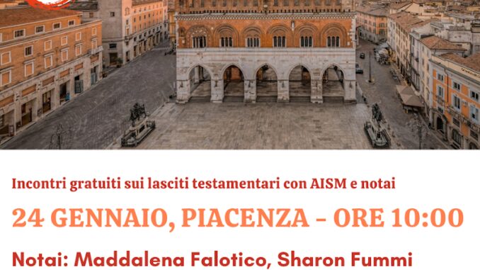 Per contribuire a divulgare una corretta informazione in merito, il Consiglio notarile di Piacenza, in collaborazione con il Consiglio Nazionale del Notariato, ha aderito alla Settimana Nazionale dei Lasciti AISM, promuovendo, insieme ai volontari dell’Associazione Italiana Sclerosi Multipla, un incontro gratuito e aperto a tutta la cittadinanza, che si svolgerà martedì 24 gennaio a Piacenza.