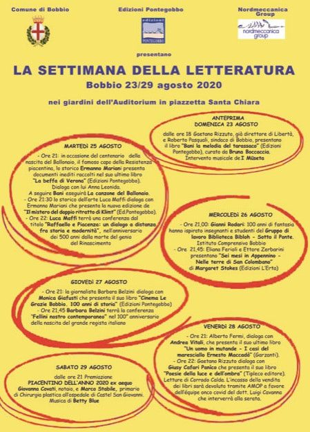 Dal 23 agosto torna la Settimana della Letteratura a Bobbio. L’evento è organizzato da Edizioni Pontegobbo, Comune di Bobbio e Nordmeccanica.