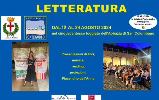 Settimana della Letteratura 2024 a Bobbio dal 19 al 24 agosto. Edizioni Ponte Gobbo con Il Comune di Bobbio, e quest’anno in collaborazione con l’Associazione Librariamente, propone una mostra libraria, incontri con gli autori, reading, momenti musicali, proiezioni e la premiazione del Piacentino dell‘Anno.