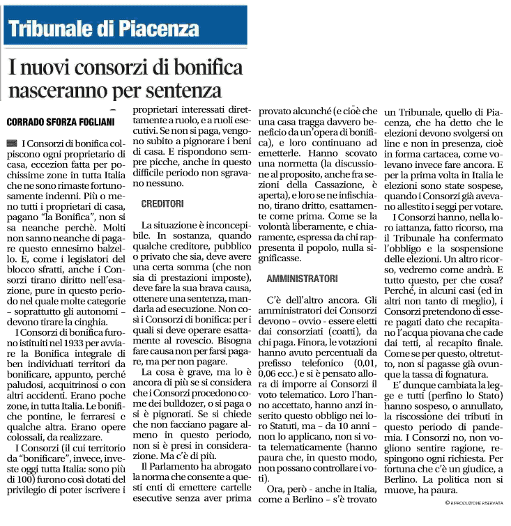 “C’è dell’altro ancora. Gli amministratori dei Consorzi devono – ovvio – essere eletti dai consorziati (coatti), da chi paga. Finora, le votazioni hanno avuto percentuali da prefisso telefonico (0,01, 0,06 ecc.) e si è pensato allora di imporre ai Consorzi il voto telematico. Loro l’hanno accettato, hanno anzi inserito questo obbligo nei loro Statuti, ma – da 10 anni – non lo applicano, non si vota telematicamente (hanno paura che, in questo modo, non possano controllare i voti). Ora, però – anche in Italia, come a Berlino – s’è trovato un Tribunale, quello di Piacenza, che ha detto che le elezioni devono svolgersi online e non in presenza, cioè in forma cartacea, come volevano invece fare ancora. E per la prima volta in Italia le elezioni sono state sospese, quando i Consorzi già avevano allestito i seggi per votare”.