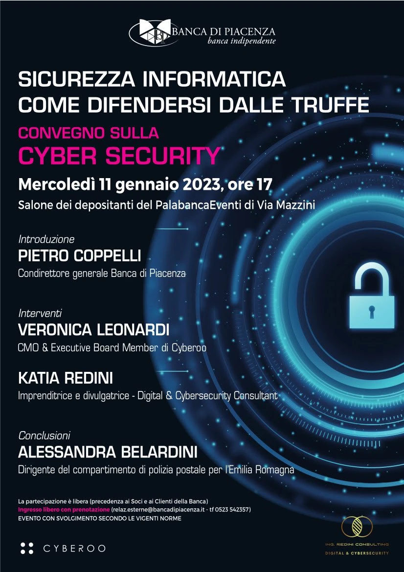 “Sicurezza informatica, come difendersi dalle truffe”. Questo il tema del convegno che si terrà, mercoledì 11 gennaio, alle 17, nel Salone dei depositanti del PalabancaEventi di via Mazzini, per iniziativa della Banca di Piacenza, in collaborazione con Cyberoo, Polizia Postale e delle Comunicazioni Emilia Romagna e Ing. Redini Consulting-Digital & Cybersecurity.
