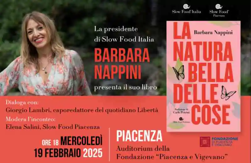 Mercoledì 19 febbraio alle ore 18 a Piacenza, presso l’auditorium della Fondazione “Piacenza e Vigevano”, sarà presentato il nuovo libro di Barbara Nappini, presidente di Slow Food Italia, La natura bella delle cose, un saggio-memoir che racconta come le nostre scelte possano contribuire a cambiare il mondo. L’autrice dialoga con Giorgio Lambri, caporedattore del quotidiano Libertà. Modera l’incontro Elena Salini di Slow Food Piacenza.