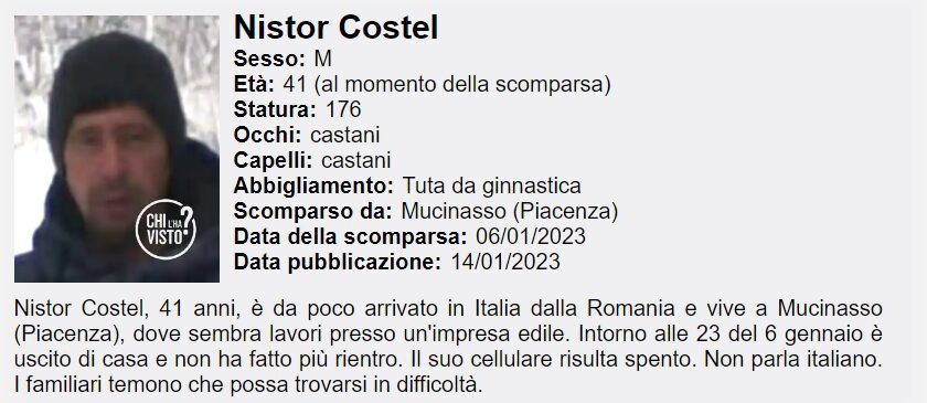 Scomparso nel nulla dal 6 gennaio, si cerca un uomo di 41 anni, Nistor Costel, di origini rumene. L’uomo avrebbe raggiunto Piacenza poco tempo fa e trovando dimora in un’abitazione di Mucinasso insieme ad alcuni connazionali, per poi iniziare a lavorare per un’azienda edile della provincia. I conoscenti lo avrebbero visto per l’ultima volta la notte dello scorso 6 gennaio. Alto 1,76, occhi e capelli castani, al momento dell’ultimo avvistamento pare indossasse una tuta da ginnastica. Parrebbe da escludere un ritorno in patria dal momento che a denunciare la sparizione è stato proprio il fratello, residente in Romania, il quale ha raccontato alla polizia rumena di aver perso i contatti col familiare: dalla notte del 6 gennaio, infatti, Nistor non avrebbe più risposto al telefono (che ora risulta spento) e non si sarebbe più messo in contatto con la famiglia.
