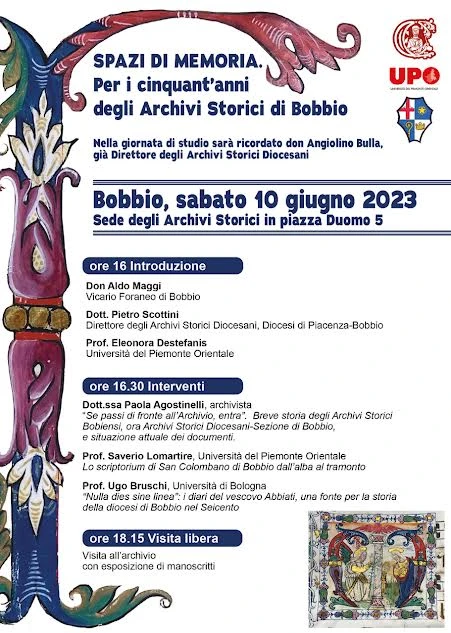 50 anni degli Archivi Storici di Bobbio, “Spazi di Memoria” convegno il 10 giugno presso la sede degli Archivi Diocesani di Bobbio alle ore 16,00.