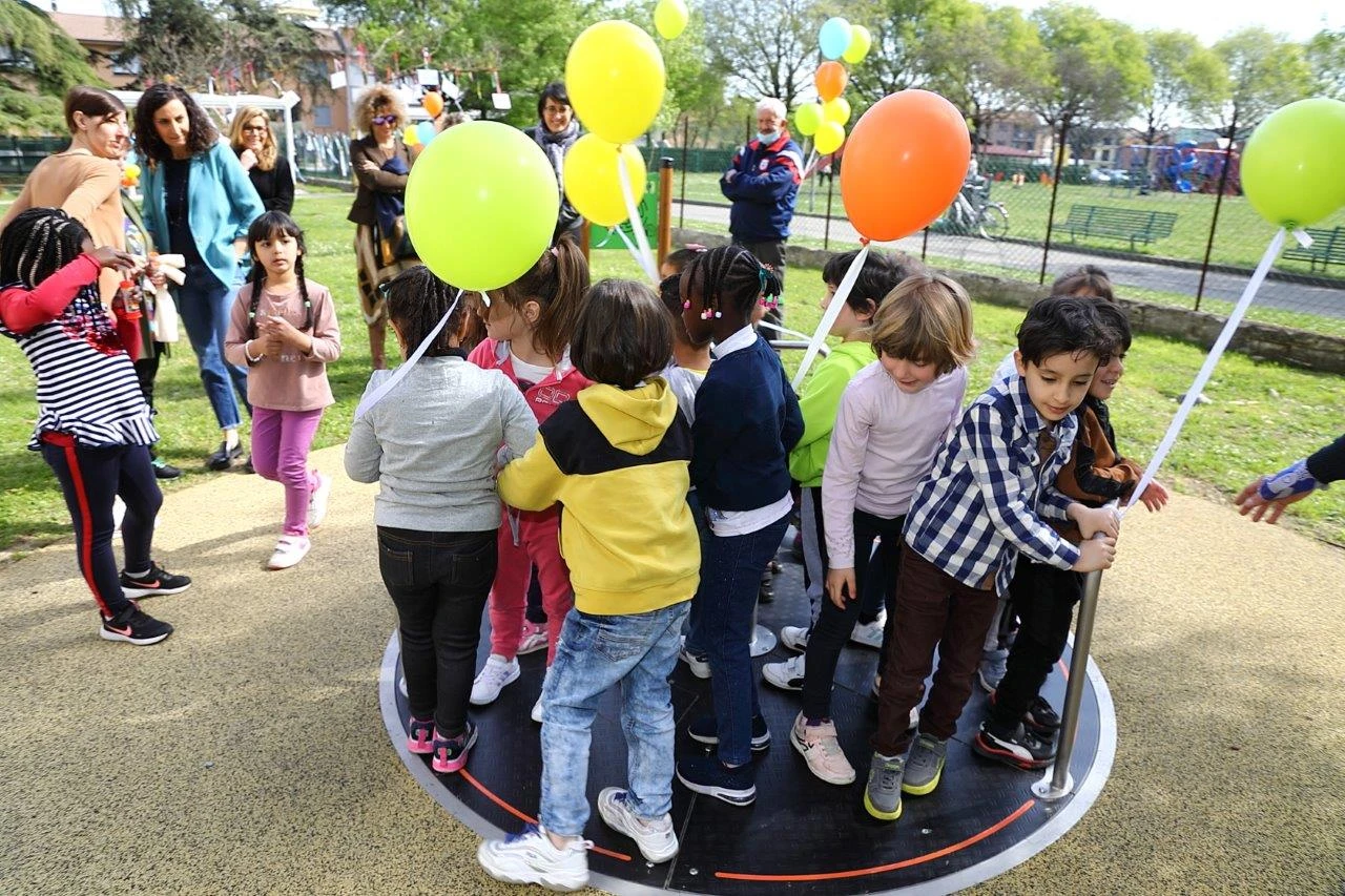 Lo spazio giochi comprende una giostra inclusiva, accessibile anche ai bambini in carrozzina, con pavimentazione in gomma antitrauma, un pannello labirinto, un pannello lavagna a gessetti, un pannello sonoro a tamburi e un gioco ippopotamo a tunnel. Si tratta di attrezzature in grado di favorire il gioco motorio e le esperienze sensoriali, vestibolari, tattili ed uditive, sostenere la motricità fine e il coordinamento oculo-manuale, allenare il senso di equilibrio e la consapevolezza spaziale, favorire il gioco simbolico e la drammatizzazione, stimolando il pensiero creativo e divergente, incentivare le relazioni positive basate sull’empatia e sulla tolleranza. Le soluzioni gioco inclusive permettono a tutti i bambini di interagire fra di loro. Ciò diminuisce la solitudine e la paura del contatto, attraverso la valorizzazione della diversità. Per i bambini con disabilità, in particolare, il gioco rappresenta un’occasione per comprendere le proprie capacità e acquisire un’immagine di sé positiva. Per i bambini normotipici il contatto con coetanei con disabilità ha effetti positivi nello sviluppo dell’empatia e della sfera emozionale.