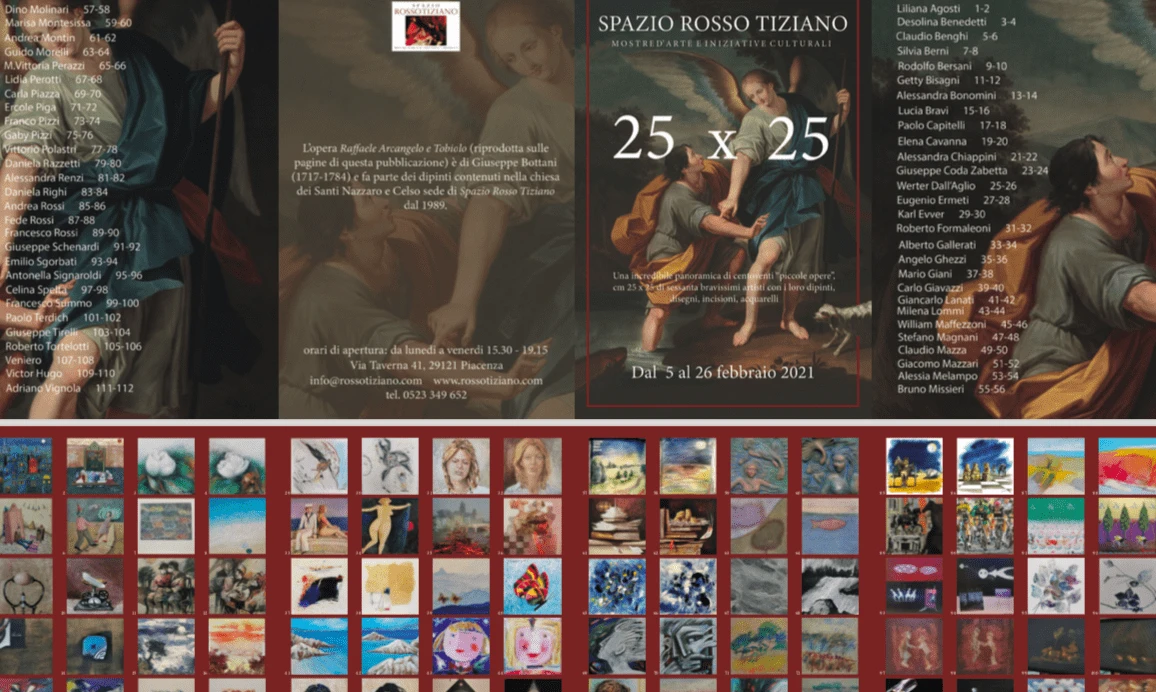 Allo Spazio Rosso Tiziano dal 5 al 26 febbraio è previsto “25X25”. Una incredibile panoramica di centododici “piccole opere” cm 25 x 25 di cinquantasei bravissimi artisti con i loro dipinti, disegni, incisioni, acquarelli.