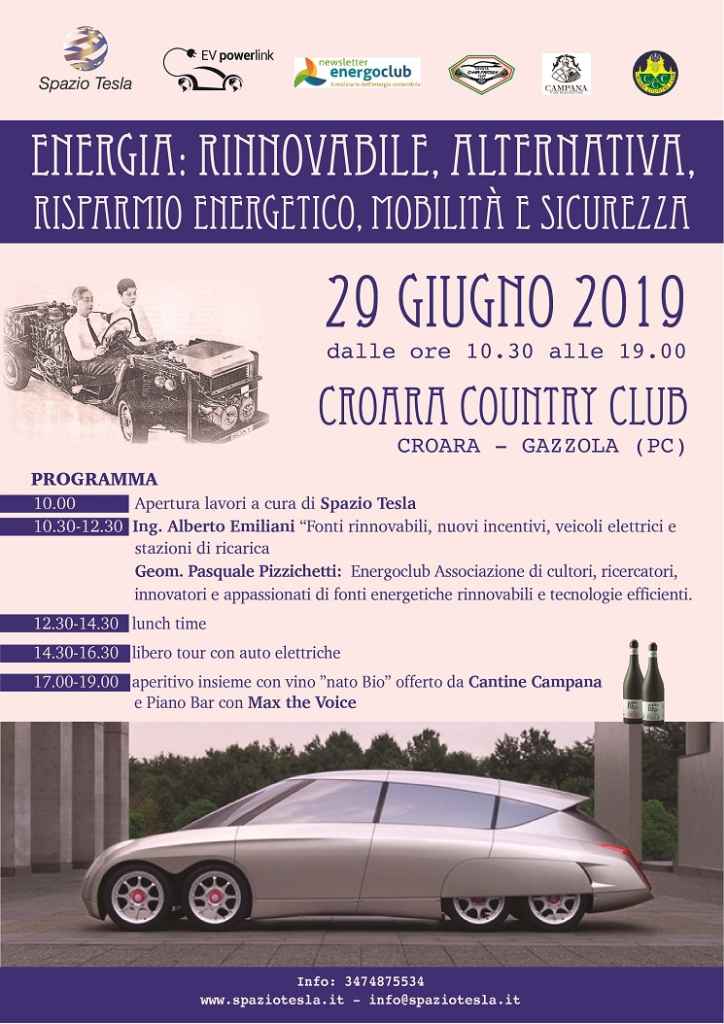 Spazio Tesla al Croara Country Club il 29 giugno presenta il terzo appuntamento con “Mobilità Elettrica alle soglie del Terzo Millennio”. In particolare si parla di: Energia Rinnovabile – Alternativa, Risparmio Energetico, Mobilità Elettrica e Sicurezza