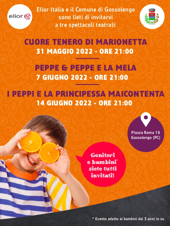 Il comune in collaborazione con la ditta Elior Italia presenta 3 spettacoli di animazione per bimbi dai 3 anni in su, nell’ambito di progetti per educazione alimentare, tema caro alla amministrazione. E’ bello imparare divertendosi, un modo leggero per porre l ‘attenzione sull’educazione alimentare che inizia già alle scuole materne.