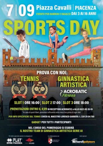 Sports Day 2024, Sabato 7 settembre, dalle ore 15:30 alle 19:00 la splendida cornice di Piazza Cavalli si trasformerà in un’arena sportiva a cielo aperto, dedicata a tutti i bambini/e e ragazzi/e dai 3 ai 16 anni. Un pomeriggio dove i giovani potranno provare gratuitamente tennis e ginnastica artistica, guidati da veri campioni.