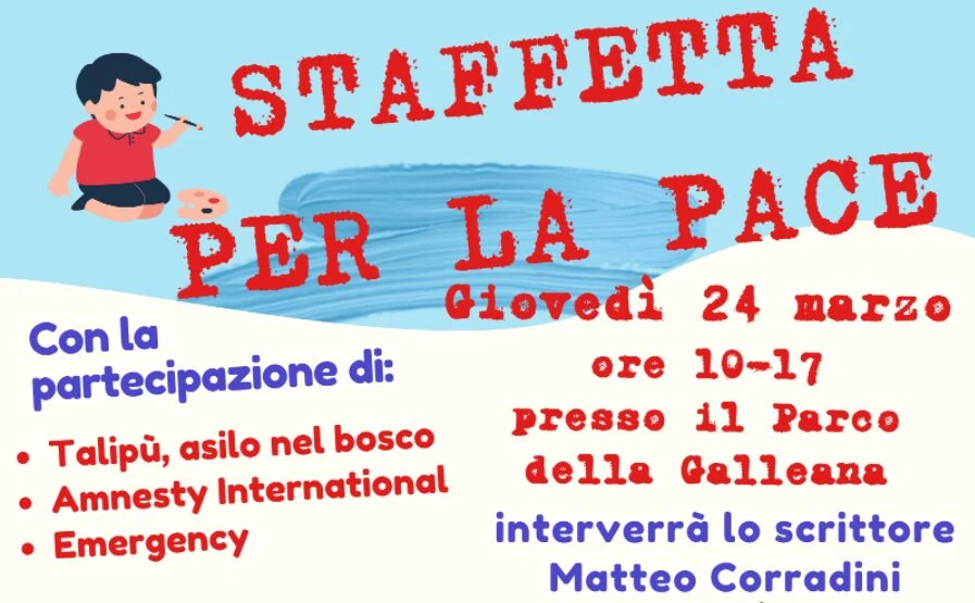 Il Quinto Circolo Didattico di Piacenza, la scuola primaria “Vittorino da Feltre”, le scuole d’infanzia “Dante” e “Collodi” presentano la Staffetta della Pace. Alunni, famiglie, insegnanti insieme per costruire il sentiero della pace, attraverso letture, canzoni, produzioni artistiche. Appuntamento giovedì 24 marzo dalle 10 alle 17 al Parco della Galleana. Interverrà lo scrittore Matteo Corradini.