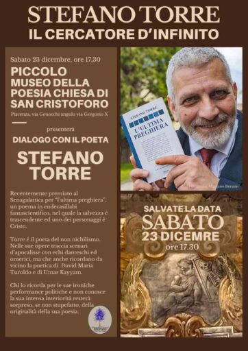 Sabato 23 dicembre alle ore 17.30 al Piccolo Museo della Poesia (Chiesa San Cristoforo) Stefano Torre sarà ospite dell’appuntamento “Dialogo con il Poeta”. Torre, recentemente è stato premiato al Concorso Biennale Nazionale di racconti inediti di fantascienza Senagalactica, presenterà il poema “L’Ultima Preghiera”.