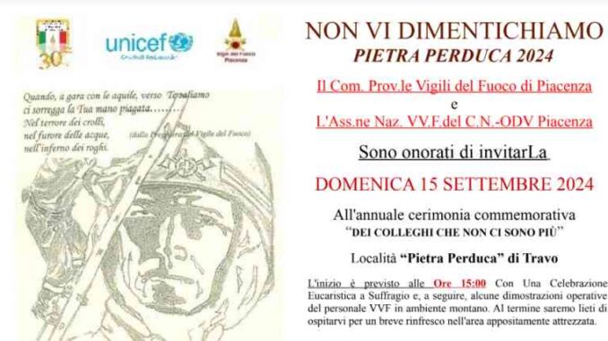 Il Comando e l’Associazione Nazionale dei Vigili del Fuoco – Sezione di Piacenza – in collaborazione con l’associazione “Amici di Perduca”, danno appuntamento a domenica prossima, 15 settembre. Come di consuetudine si svolgerà presso la “Pietra Perduca” una manifestazione commemorativa in ricordo “dei colleghi che non ci sono più”.