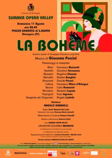 Dal Comune di Rivergaro per volere dell’ Amministrazione uscente, nell’ intendimento di proseguire con la tradizione consolidata nella proposta estiva dell’ Opera Lirica, si rende aderente nella seconda edizione del progetto innovativo e fortemente includente le territorialità confinanti. Una proposta che include la realizzazione dell’ Opera La Bohéme di G. Puccini. in forma scenica con Orchestra, nella splendida Piazza del Sagrato della Chiesa di Sant’ Agata. Presenze prestigiose anche in questo caso a partire dalla