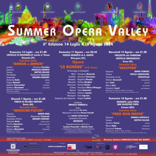 Entusiasti di aderire a questa iniziativa ogni comune mette a disposizione, oltre a risorse economiche proprie, anche bellissime location al fine di promuovere la bellezza dei luoghi attraverso una proposta musicale coerente e valorizzante. La mission è dunque di interessare le aree periferiche montane e creare un vero circuito culturale sovralocale. Si realizzerà l’Opera La Bohéme di G. Puccini in forma scenica a Rivergaro e appuntamenti nei comuni di Travo SAXOPERA, Gazzola MANON vs MANON, Fanano PARIS MON AMOUR Baiso AMERICAN PUCCINI nel centenario Pucciniano.