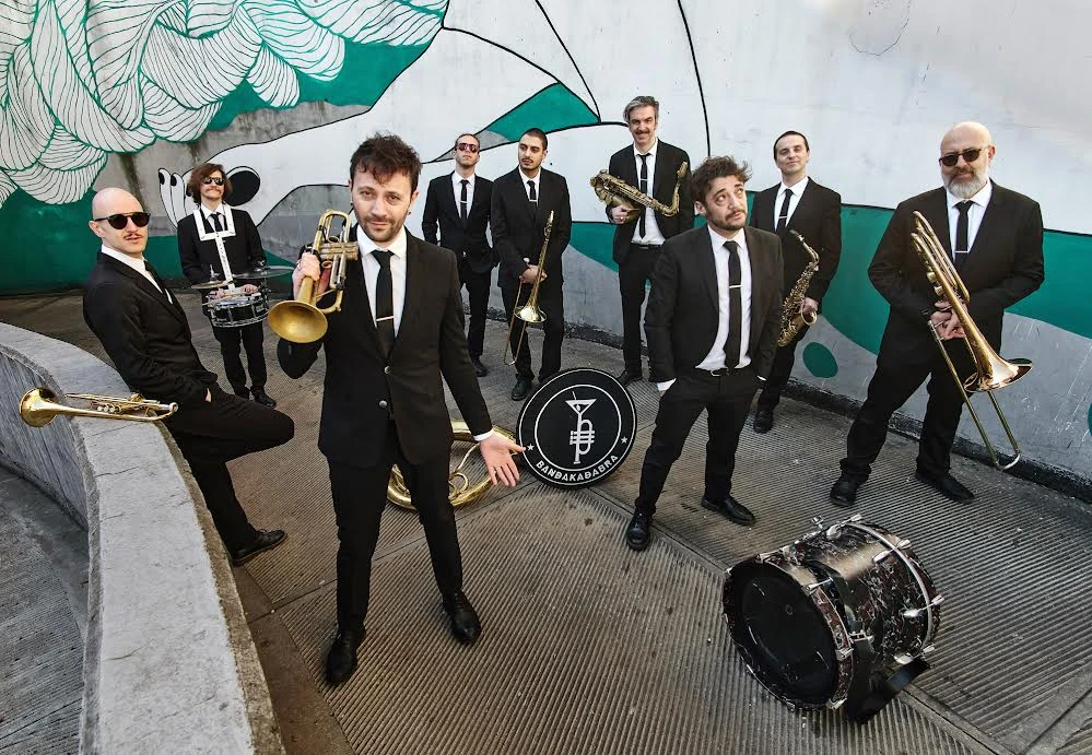 Sette fiati. Due percussioni. Rocksteady, balkan, swing una vera “orchestra da passeggio” che unisce l’energia delle formazioni street al sound delle big band anni Trenta, che sul palco si trasformerà in una swing band d’antan con un leader alla voce e al trombone in “Ok, Boomer”.