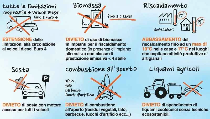 Si ricorda inoltre che è vietato, in presenza di sistemi di riscaldamento alternativi, l’utilizzo di generatori di calore domestici alimentati a biomassa legnosa, le cui prestazioni energetiche ed emissive non siano in grado di rispettare i valori previsti almeno per la classe 4 stelle. Vige, infine, il divieto assoluto di combustioni all’aperto per qualsiasi tipologia (falò, barbecue, fuochi d’artificio, ecc.) – anche relativamente alle deroghe per piccoli cumuli di residui vegetali bruciati in loco – così come il divieto di spandimento dei liquami zootecnici, fatta eccezione per le tecniche con interramento immediato dei liquami e iniezione diretta al suolo.