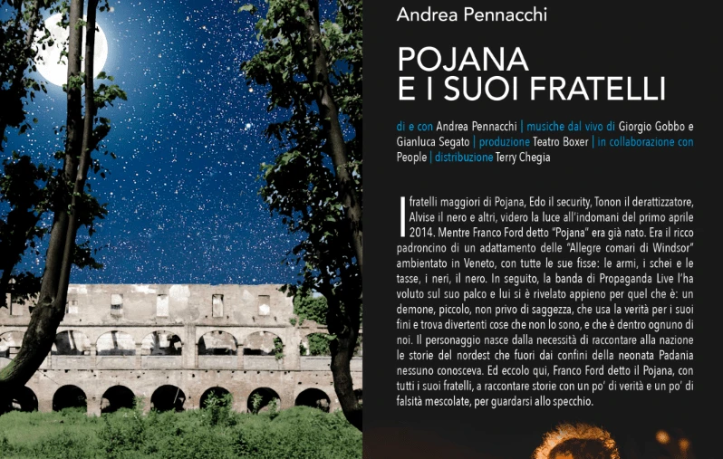 In seguito, la banda di “Propaganda Live” l’ha voluto sul suo palco e lui si è rivelato appieno per quel che è: un demone, piccolo, non privo di saggezza, che usa la verità per i suoi fini e trova divertenti cose che non lo sono. È significativo e terribile che i veneti siano diventati, oggi, i cattivi: evasori, razzisti, ottusi. Di colpo. Da provinciali buoni, gran lavoratori, un po’ mona, che per miseria migravano a Roma a fare le servette o i carabinieri (cliché di molti film in bianco e nero), ad avidi padroncini, così, di colpo, con l’ignoranza a fare da denominatore comune agli stereotipi. Un enigma, che si risolve in racconto: passando da maschere più o meno goldoniane a specchio di una società intera. Una promozione praticamente. Ed eccolo qui, Franco Ford detto il Pojana , con tutti i suoi fratelli a raccontare storie con un po’ di verità e un po’ di falsità mescolate, per guardarsi allo specchio. Perché il Pojana è un po’ dentro ognuno di noi.