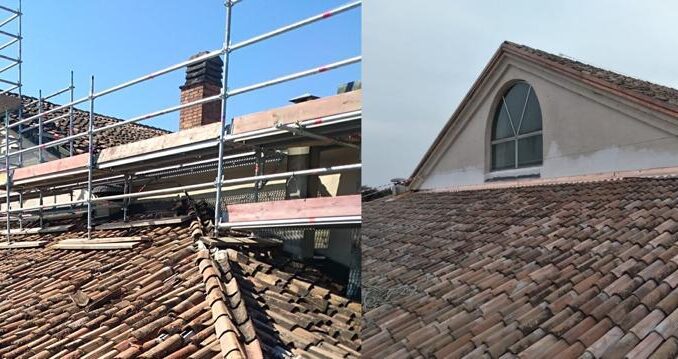 Dopo la completa rimozione del pacchetto di copertura, i tecnici hanno fissato le lastre sottocoppo e posato coppi di recupero agganciandoli uno all’altro per evitare problemi di scivolamento. Hanno inoltre installato il sistema “Linea vita” ovvero un dispositivo di ancoraggio per permettere di effettuare in sicurezza i lavori di manutenzione della copertura.