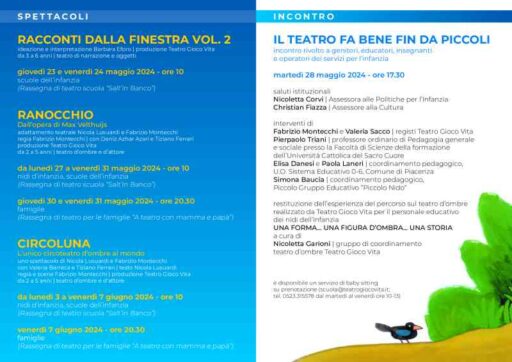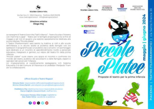 Teatro per ragazzi a Piacenza, le rassegne“Salt’in Banco” – Teatro Scuola e “A teatro con mamma e papà” – Teatro per le famiglie, propongono tra la fine di maggio e gli inizi di giugno una sezione appositamente dedicata alla prima infanzia: “PICCOLE PLATEE”. Un progetto di Teatro Gioco Vita, curato da Simona Rossi, responsabile progetti teatro ragazzi, teatro scuola e formazione, proposto dal Centro di produzione teatrale diretto da Diego Maj con la Fondazione Teatri, la collaborazione dell’Associazione Amici del Teatro Gioco Vita e il sostegno della Fondazione di Piacenza e Vigevano nell’ambito del programma “InFormazione Teatrale”. Come tutte le attività di Teatro Gioco Vita, il cartellone “Piccole platee” è realizzato con il contributo di MIC e Regione Emilia-Romagna.