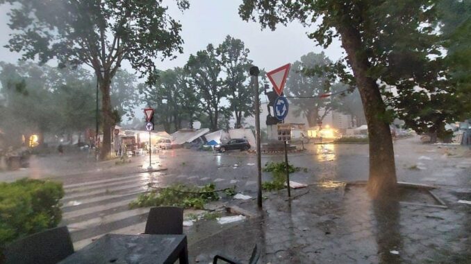 “Un disastro, il temporale ha distrutto tutto, la merce esposta all’acqua, una cosa impressionante”, commenta Mario, ambulante titolare di una paninoteca. “Veniamo da due anni difficili e queste fiere per noi rappresentano una ripartenza: io personalmente puntavo molto sulla serata e quello che è successo ha rappresentato un danno importante per la mia attività. Io ho avuto danni, ma fortunatamente posso continuare a lavorare. Altri, invece, hanno avuto ombrelloni distrutti e dovranno attendere”.