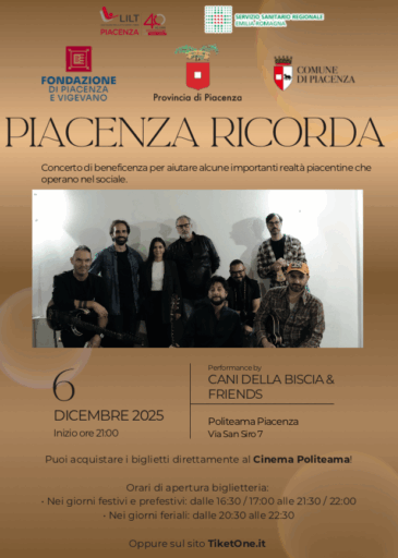 Sabato 6 dicembre alle ore 21 il Teatro Politeama ospiterà la terza edizione di “Piacenza Ricorda“, un appuntamento musicale, benefico e di grande impatto emotivo oramai diventato una pietra miliare della solidarietà della nostra città.