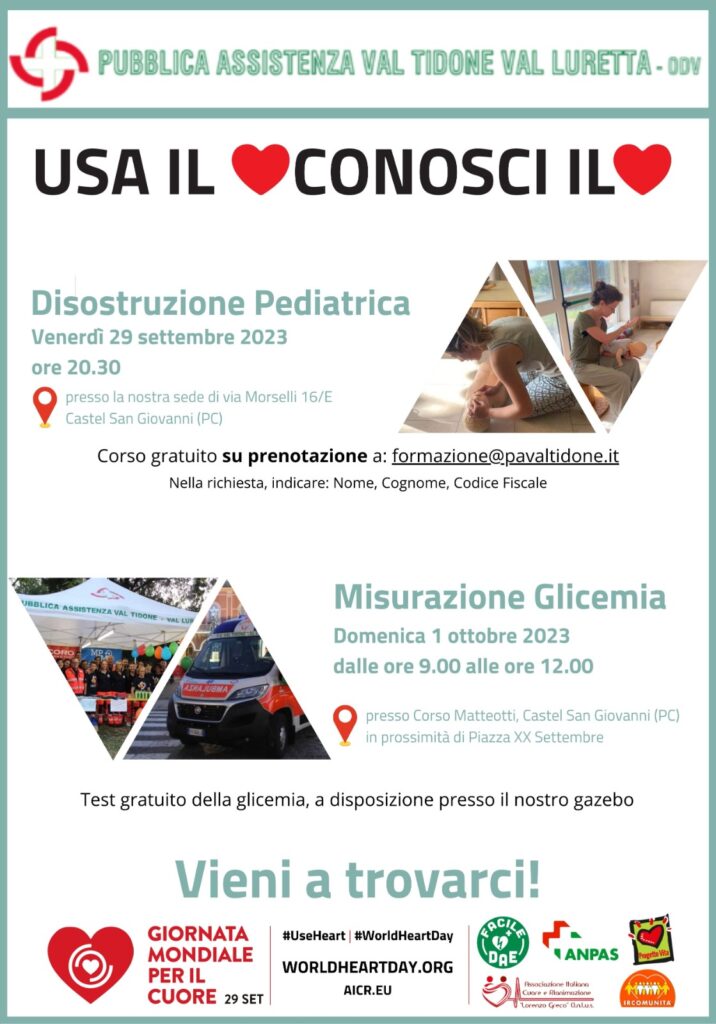 In occasione della Giornata del Cuore i volontari della Pubblica Assistenza Val Tidone Val Luretta, propongo due appuntamenti. Alle 20.45 si parlerà di disostruzione pedriatrica, mentre domenica 1 ottobre: misurazione glicemia.