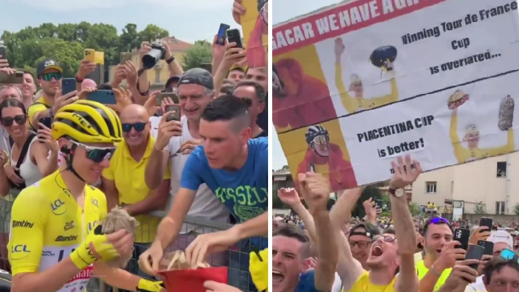 Il Tour de France doveva promuovere Piacenza? Per vedere i risultati è ancora presto. Certo è però che alcuni dei piacentini presenti questa mattina in viale Malta hanno già fatto tanto. Anzi, verrebbe da dire tantissimo. Alcuni tifosi sono riusciti a fermare Tadej Pogačar prima della partenza e a regalargli una Coppa Piacentina. La scena è stata ripresa in video e la clip è stata pubblicata addirittura da Eurosport sul proprio canale Twitter.