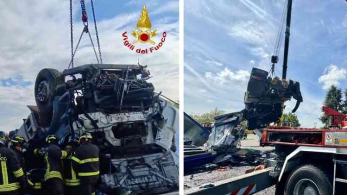In seguito all’impatto, il tir si è ribaltato e il conducente del mezzo pesante è deceduto. Inoltre il rimorchio ha letteralmente schiacciato la vettura coinvolta nello schianto: oltre allo schiacciamento, gli occupanti hanno dovuto fare i conti anche con le taniche di acido che si sono rovesciate all’interno dell’abitacolo.