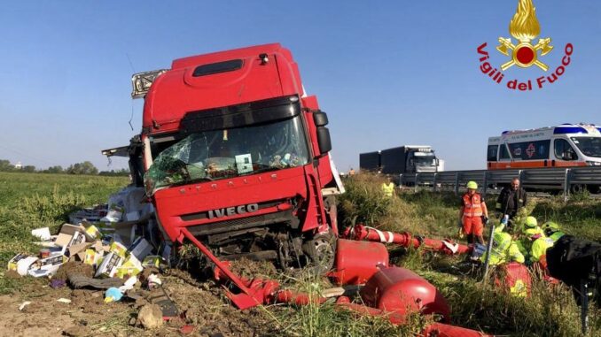 Tir fuori controllo in A21, si schianta contro il guard rail e finisce fuori strada – FOTO