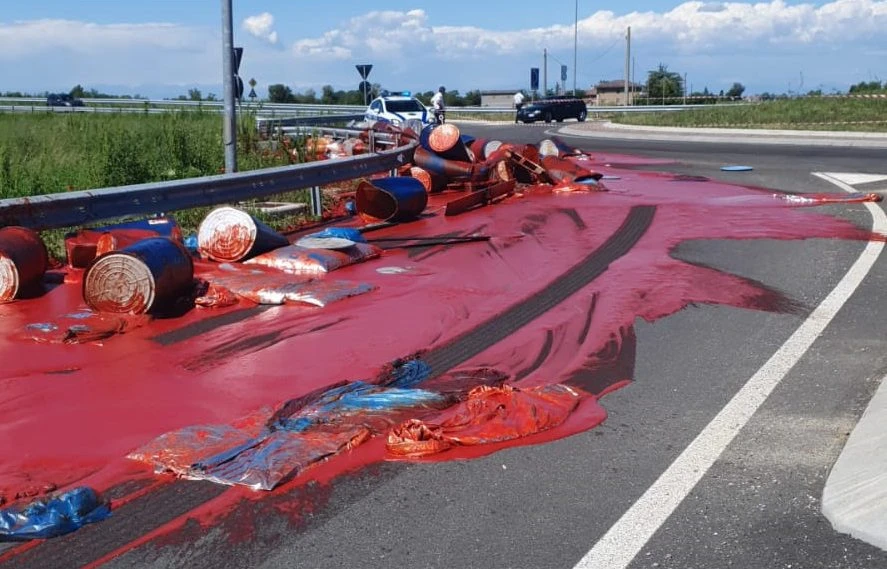 Un tir, per motivi da chiarire, avrebbe infatti perso alcuni fusti contenenti polpa di pomodoro e il liquido ha invaso la carreggiata. Non si registrano feriti.