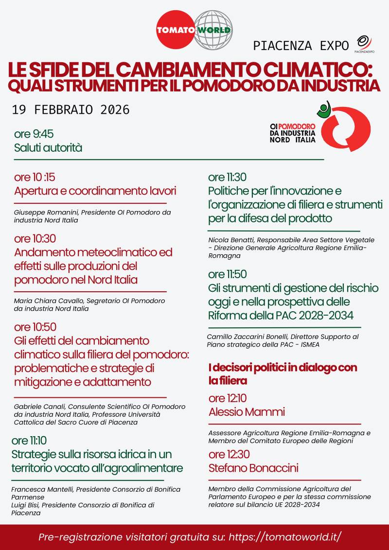 L’OI Pomodoro da Industria Nord Italia, nell’ambito del Tomato Word, organizza il convegno inaugurale “Le sfide del cambiamento climatico: quali strumenti per il pomodoro da industria”.