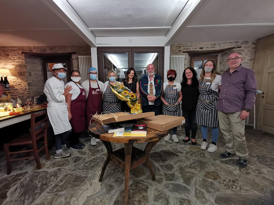 Durante il pranzo, prima di partire per una presentazione a Traversetolo, le persone che pranzavano in osteria lo hanno ovviamente riconosciuto e così è partita di nuovo la “processione” al suo tavolo per esprimere gratitudine per il suo modo di raccontare le storie e per chiedere le immancabile foto e l’autografo sui suoi libri.