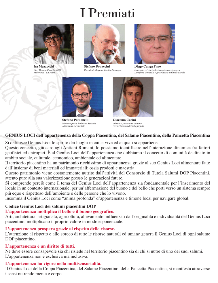 “Ringraziamo il Comune di Piacenza perché negli anni ha dimostrato di credere in questo evento esattamente quanto noi”, commenta Antonio Grossetti, presidente del Consorzio Salumi Dop Piacentini. “Con la Coppa d’Oro intendiamo premiare dei valori, valori positivi che contraddistinguono il nostro territorio”.