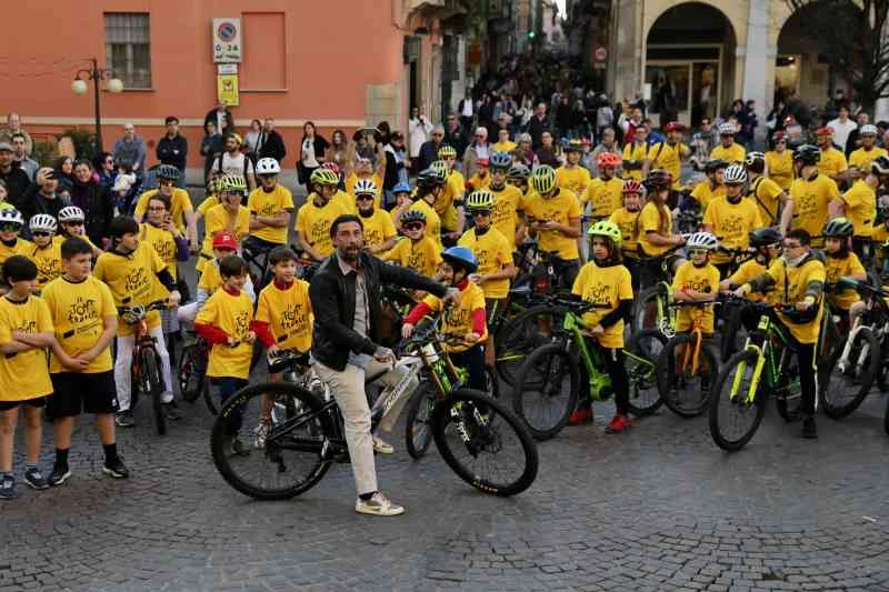 Piazza Cavalli è una marea gialla, una marea di bambini entusiasti che questo pomeriggio hanno mandato un messaggio chiaro agli organizzatori del Tour de France: “Non vediamo l’ora che arrivi il primo luglio”. Già perché Piacenza, il primo luglio, sarà punto di partenza per una delle tappe iniziali.