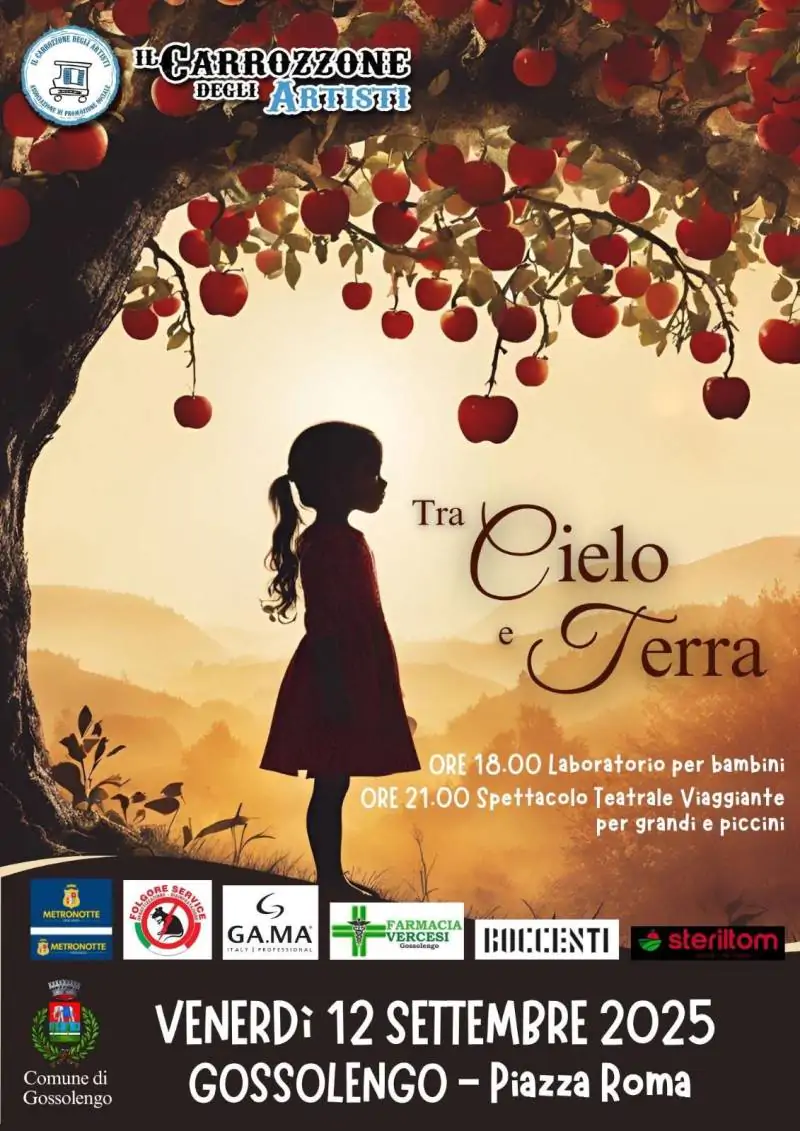 Venerdì 12 Settembre la piazza di Gossolengo ospiterà, come ormai è tradizione, la compagnia teatrale “Il Carrozzone degli artisti” che porterà in scena il nuovo spettacolo “Tra cielo e terra”.