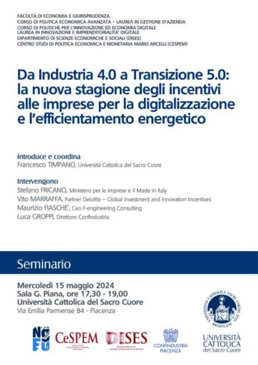 Transizione 5.0, domani, mercoledì 15 maggio alle 17.30,la Sala Piana dell’Università Cattolica del Sacro Cuore, a Piacenza, ospita l’evento “Da Industria 4.0 a Transizione 5.0: la nuova stagione degli incentivi alle imprese per la digitalizzazione e l’efficientamento energetico”. Un seminario aperto al pubblico organizzato in collaborazione con Lab NGEU, il Centro Studi di Politica Economica e Monetaria “Mario Arcelli”, il Dipartimento di Scienze Economiche e Sociali dell’Università Cattolica e Confindustria Piacenza.