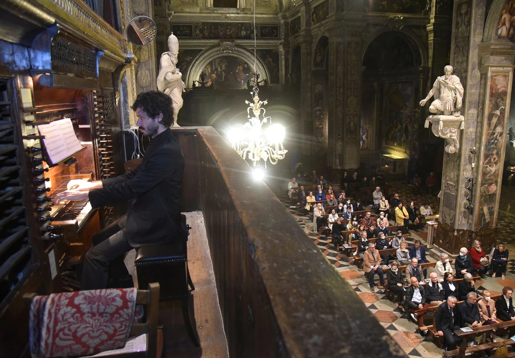 Lo spettacolo è proseguito con gli organisti Alessandro Achilli, Paolo Bottini e Federico Perotti che hanno suonato musiche di Mozart, Clementi e padre Davide da Bergamo. Fu proprio il giovane organista bergamasco Felice Moretti (questo il suo vero nome) a progettare nel 1825 il grande Serassi, uno strumento che offre una varietà di suoni veramente incredibile. Padre Davide è stato il maggior organista e compositore di musica per organo del periodo risorgimentale. A 17 anni, nel 1818, entrò nell’Ordine francescano e fu assegnato a Santa Maria di Campagna. In 45 anni compose duemila pezzi per organo e 500 brani vocali. Un tesoro custodito negli archivi della Basilica.