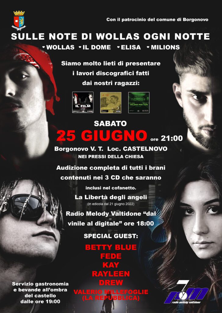 Il progetto si chiama “La libertà degli angeli”, un cofanetto contenente 3 cd con tutti i brani dei tre amici. L’opera sarà presentata il 25 giugno in località Castelnovo, Borgonovo, nei pressi della chiesa. A partire dalle 21, nel corso della serata dal titolo “Sulle note di Wollas ogni notte” , si potranno ascoltare i brani di questa raccolta.