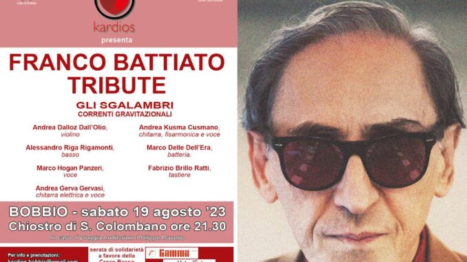 Franco Battiato Tribute , il 19 agosto a Bobbio con “Gli Sgalambri, Correnti Gravitazionali”. Lo spettacolo dedicato al grande cantautore italiano che ha saputo passare dalla musica prog, al pop fino a cimentarsi con l’opera, è in programma sabato nel Chiostro di San Colombano alle ore 21,30.