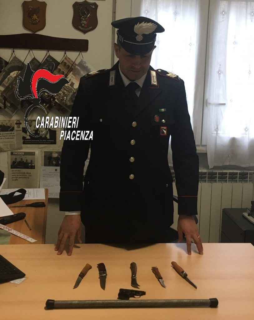 E’ stato fermato sulla via Emilia e i militari durante gli accertamenti hanno rinvenuto cinque coltelli. In particolare tre a serramanico, uno “per funghi” ed uno “a scatto”. Inoltre rinvenuto un tubo metallico di circa 60 cm con due gommini di plastica inseriti alle estremità, ed una piccola pistola ad aria compressa.