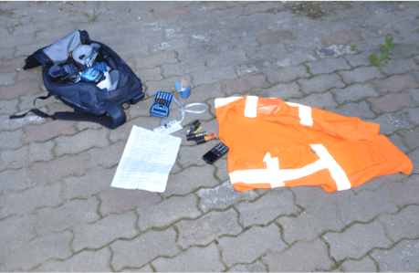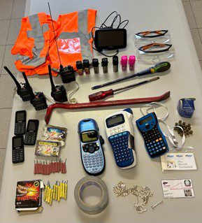 I carabinieri hanno trovato e sequestrato diverse bombolette di spray urticante, materiale pirotecnico, attrezzature e dispositivi elettronici vari per simulare la misurazione delle contaminazioni idriche. Hanno trovato anche un tesserino di riconoscimento per tecnico società acquedotto, pettorina catarifrangente, varie ricetrasmittenti e telefoni cellulari. Vi era poi un foglio manoscritto riportante l’elenco delle frequenze radio in uso alle centrali operative dell’Arma dei Carabinieri su tutto il territorio nazionale, varie targhe di autovetture. Infine anche arnesi atto allo scasso e indumenti per il travisamento in occasione degli eventi delittuosi.