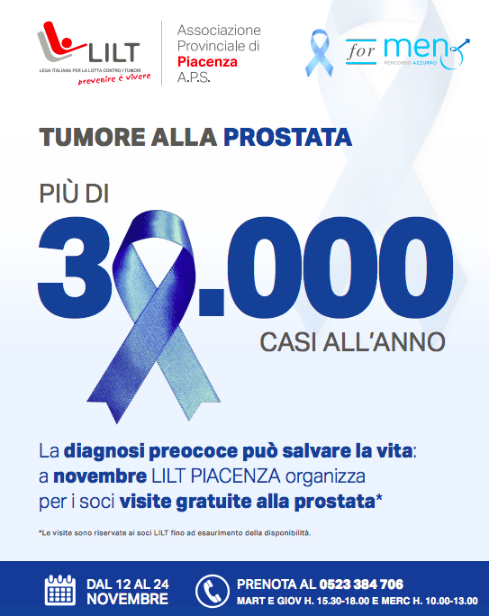 Proprio per questo la Lega Italiana per la lotta ai tumori, dal 12 al 24 novembre LILT, con il patrocinio dell’Ausl di Piacenza, organizza per i soci visite gratuite alla prostata. Le visite si possono prenotare allo 0523 384 706 il martedì pomeriggio o il mercoledì mattina.