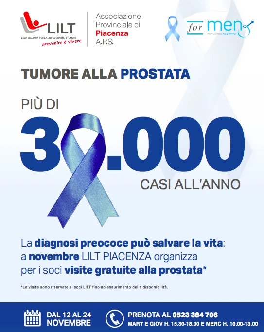 Tumore alla prostata, la Lilt Piacenza organizza il percorso azzurro Lilt For Men, visite gratuite fino al 24 novembre. La malattia colpisce più di 3000 uomini all’anno, ma la diagnosi precoce può salvare la vita.