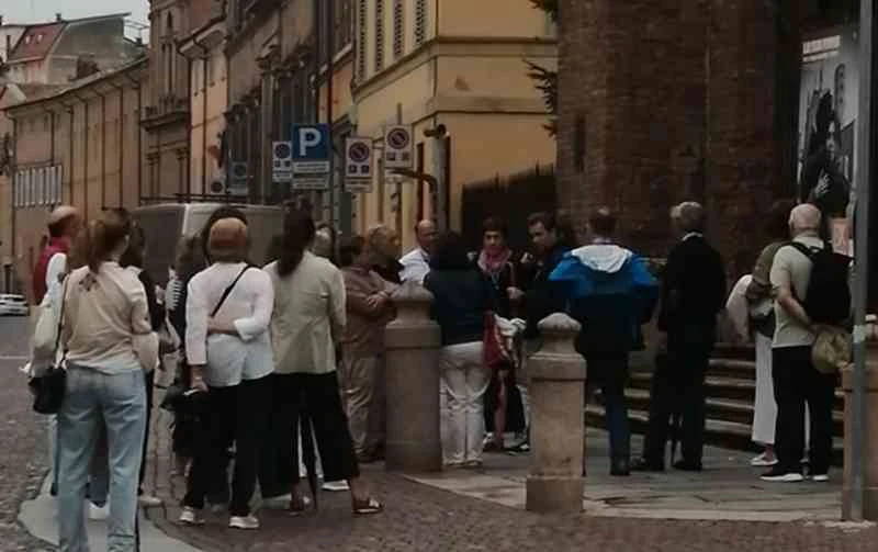 Un gruppo di turisti intento ad ascoltare le spiegazioni della guida, di fronte alla basilica di Sant’Antonino. La foto è stata scattata da un cittadino che ha affidato la segnalazione al gruppo Facebook, “Piacenza – Rob da matt”.
