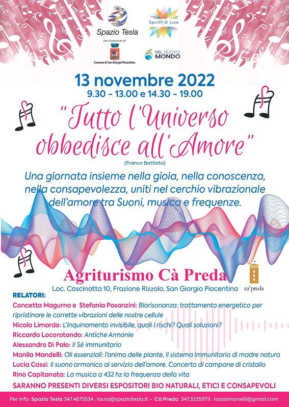 “Tutto l’Universo obbedisce all’amore”, il 13 novembre a San Giorgio Piacentino presso l’agriturismo Cà Preda (località Cascinotta 10, Frazione Rizzolo). Una domenica tra Spazi Conferenze, Area Mercatini, Musica dal Vivo e Test benessere. Inoltre “Il Gusto dell’autunno” pranzo con la polentata e la castagnata prodotte dal Gruppo Alpini di San Giorgio Piacentino.
