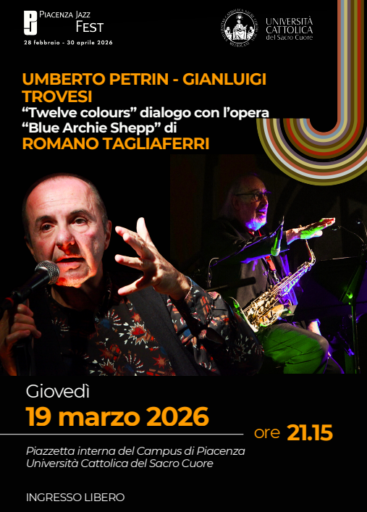 Giovedì 19 marzo alle 21.15 presso la Piazzetta interna del Campus di Piacenza dell’Università Cattolica si terrà il concerto jazz “Twelve colours” dialogo con l’opera “Blue Archie Shepp” di Romano Tagliaferri, a cura di Umberto Petrin al pianoforte e di Gianluigi Trovesi al clarinetto, nell’ambito della rassegna Piacenza Jazz Fest (28 febbraio-30 aprile 2026).