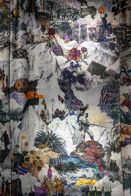 Salendo al primo piano, si accede al progetto come un limone lunare / che non riposa mai di Francesco Simeti, un’anticipazione della mostra-atelier personale che l’artista presenterà a settembre e che comprende le due grandi opere Rubble, 2007 e Curtain, 2017, un’indagine più che mai attuale sul tema della guerra.
