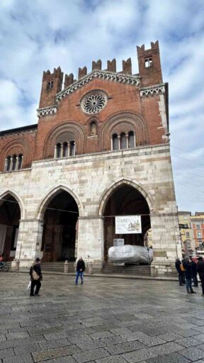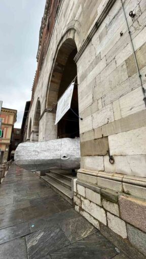 Nel loggiato medievale di piazza Cavalli, questa mattina allestito in circa 3 ore di lavoro, il Capodoglio Giovanni, una delle più grandi opere SCART mai realizzate. Si tratta di un cetaceo di ben 12 metri (a grandezza naturale, quindi), realizzato da Edoardo Malagigi, con la collaborazione scientifica di Sabina Airoldi. L’opera, che interpreta le forme di un vero Capodoglio presente nel Parco Pelagos (area marina dell’Alto Tirreno fra Italia e Francia), è stata realizzata con circa 4.000 cartoni di poliaccoppiato (il cosiddetto tetrapak), dai quali sono tagliate circa 5.500 piccole ondine a simulare la pelle dell’animale, per sensibilizzare una volta di più sul tema dell’inquinamento dei mari, che anche nel Mediterraneo sta assumendo dimensioni drammatiche.